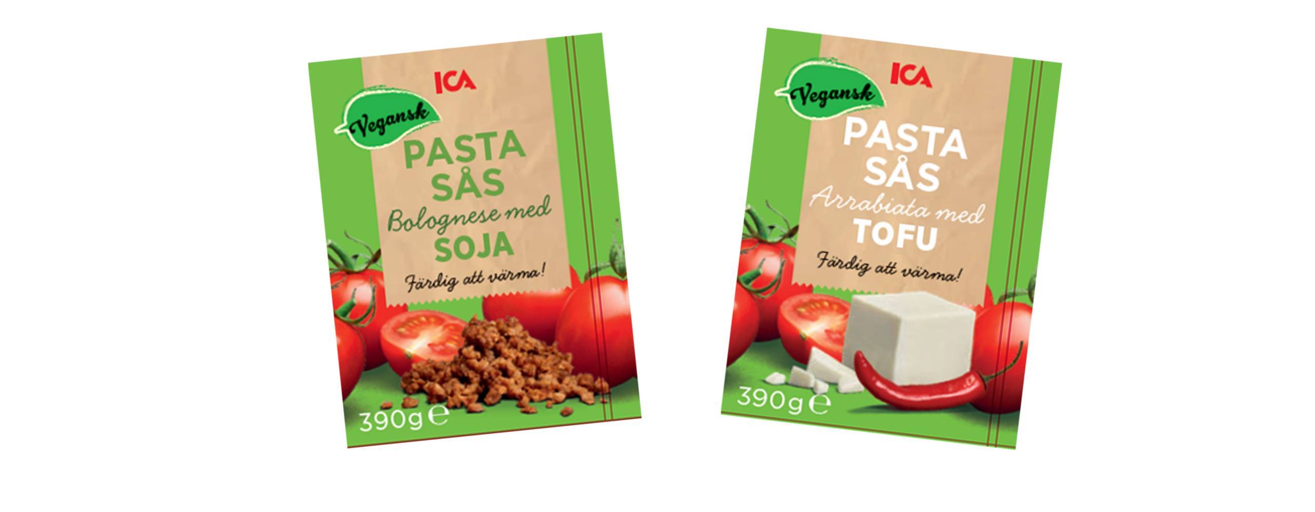 Nu lanserar ICA två veganska såser som förenklar vardagsmiddagar det är klassisk Bolognese med sojafärs  och en Arrabiata med tofu. Allt du behöver göra är att värma upp såsen och servera med till exempel pasta. Såserna kommer i samma miljösmarta FSC-märkta tetraförpackning som alla ICAs pastasåser.