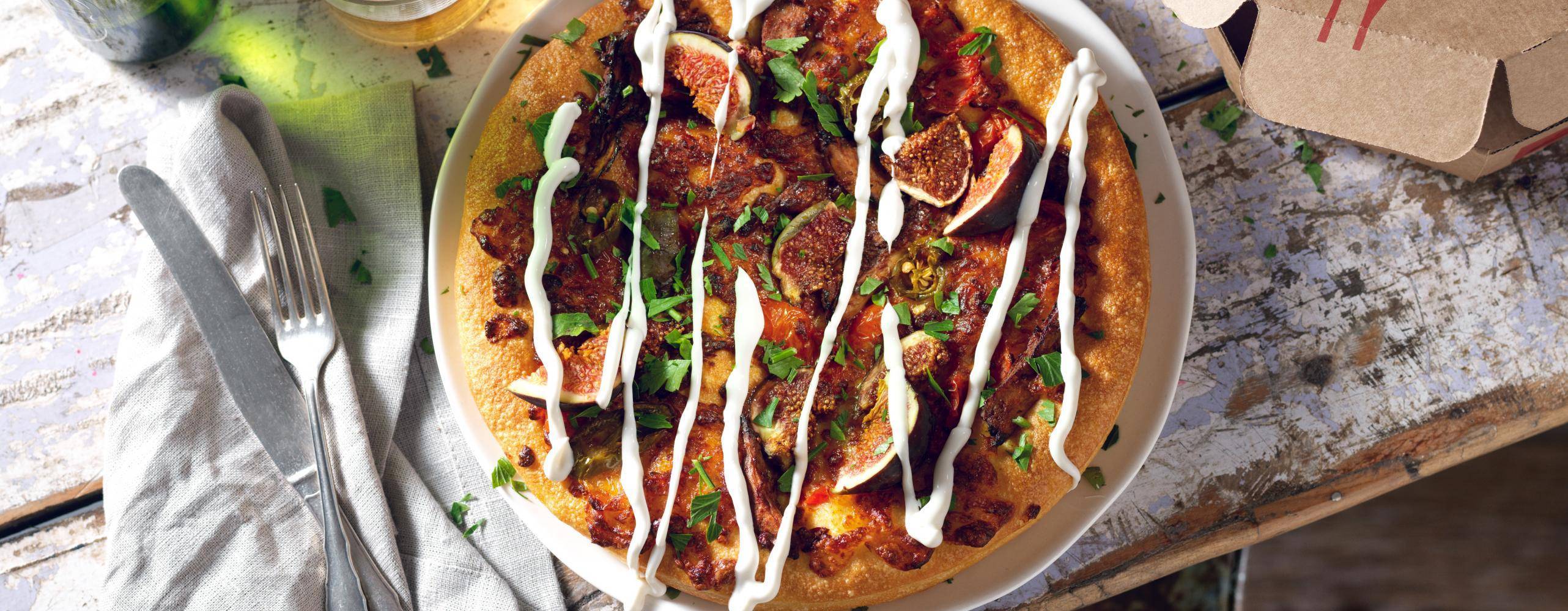 Den nya veganpizzan på Pizza Hut är BBQ No Meat Hot n'Sweet. OBS! Du måste be om en vegansk version. Den innehåller vegansk ost, Oumph!-BBQ Strips, cocktailtomater, färska fikon, jalapenos, persilja och Oatly Fraiche och deras pizzabotten som är helt glutenfritt.