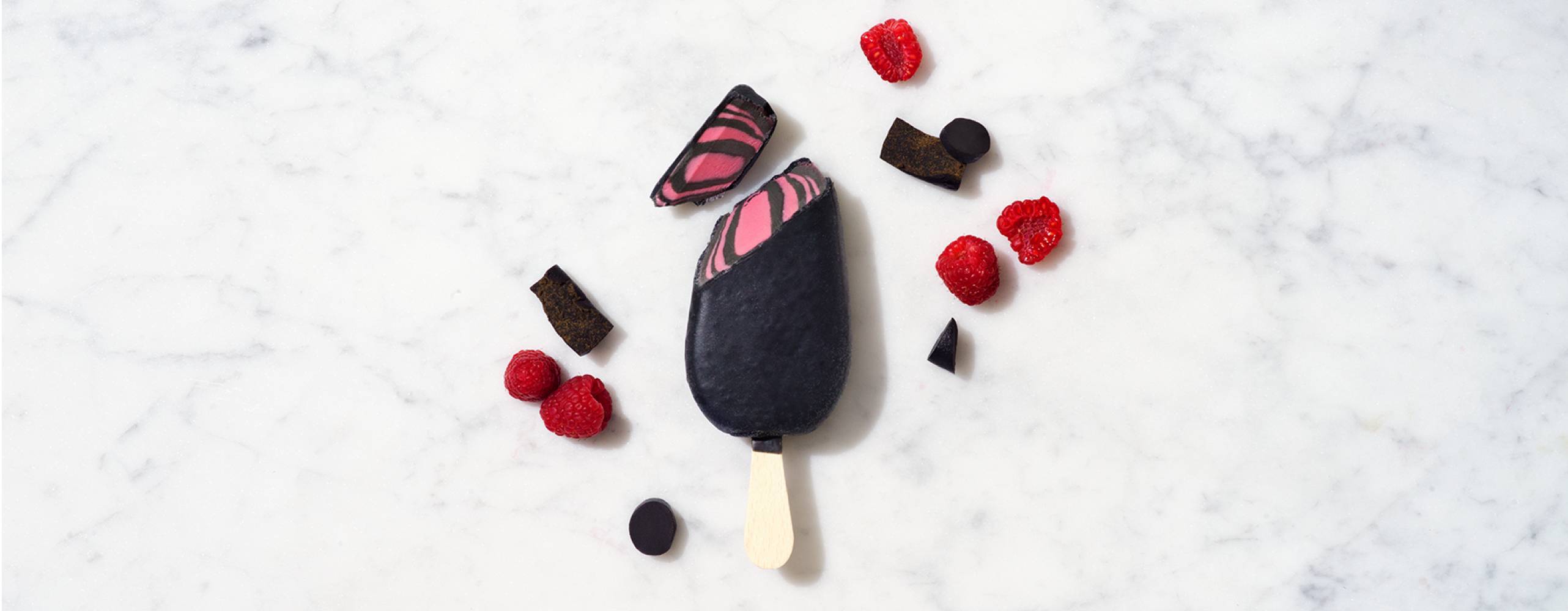 Nyheten är fylld av ljuvlig hallonsorbet och lakritsglass som doppas i lakrits, vilket ger den dess härliga kontraster. Hallonsorbeten är gjord av nordiska hallon och den veganska lakritsglassen är cashewbaserad. Mer detaljerat innehåller den lakritsglass 35%, hallonsorbet 41%, lakrits 21%
