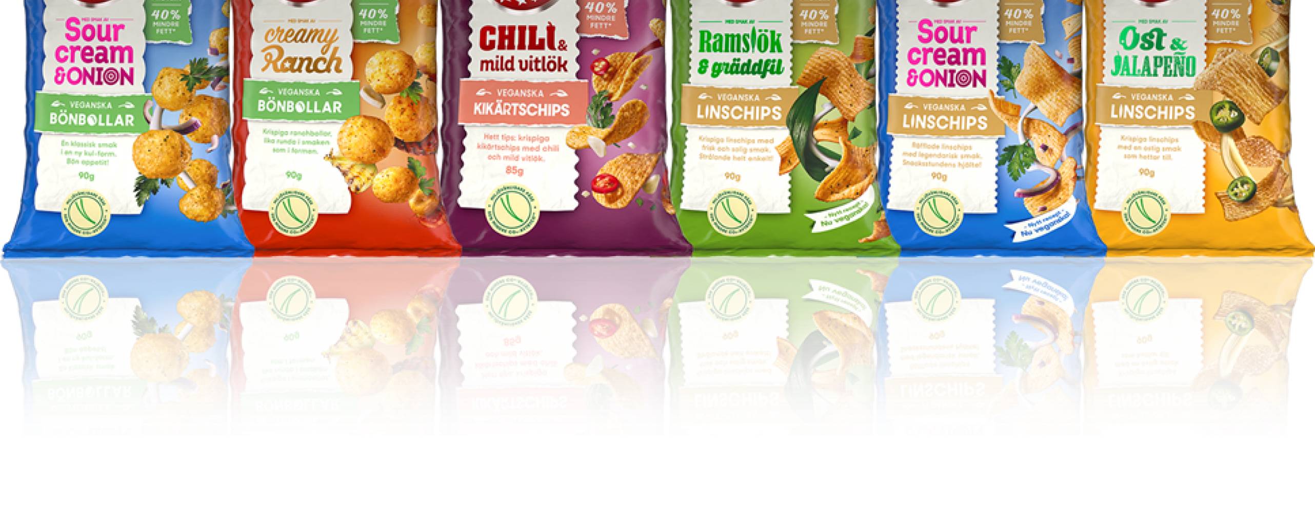 Dessutom lanserar varumärket ett helt nytt linschips med smak av Ost & jalapeño.  Sedan tidigare omfattar det veganska sortimentet även bönbollar och kikärtschips i flera smaker.