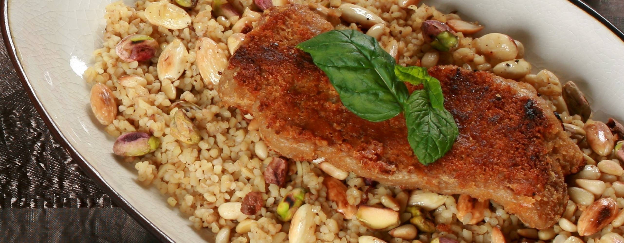 - Smält margarinet i en kastrull, tillsätt bulgur och fräs en kort stund. Tillsätt kryddor efter smak och rör om.