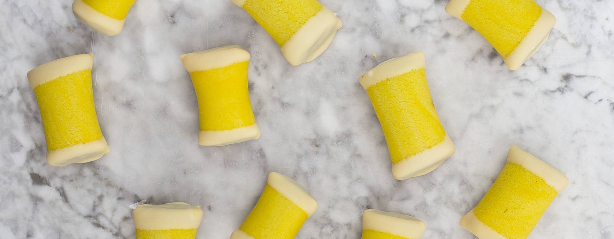 - Rulla ihop med ½-1 centimeter marsipan omlott och rulla ut till valfri tjocklek. Skär rullen i delar, doppa ändarna i smält choklad och placera på bakplåtspapper.