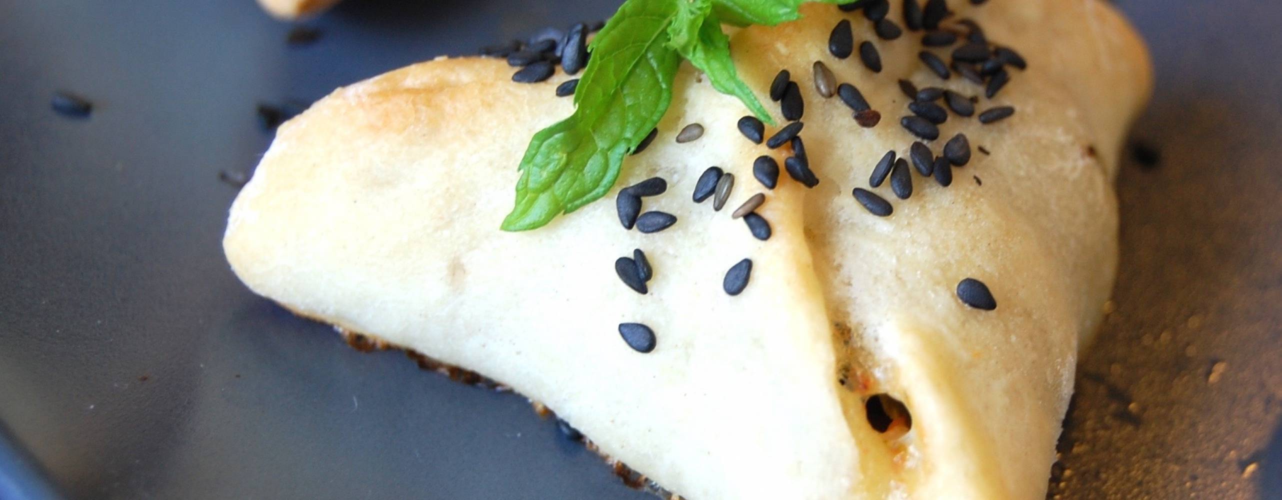 - Kavla ut degen till den är ca ½ cm tjock och ta ut cirklar på ca 8 cm i diameter (t ex med hjälp av ett glas). Lägg en matsked fyllning i mitten av varje cirkel. Nyp ihop degen till en trekantigt knyte eller halvmåne.