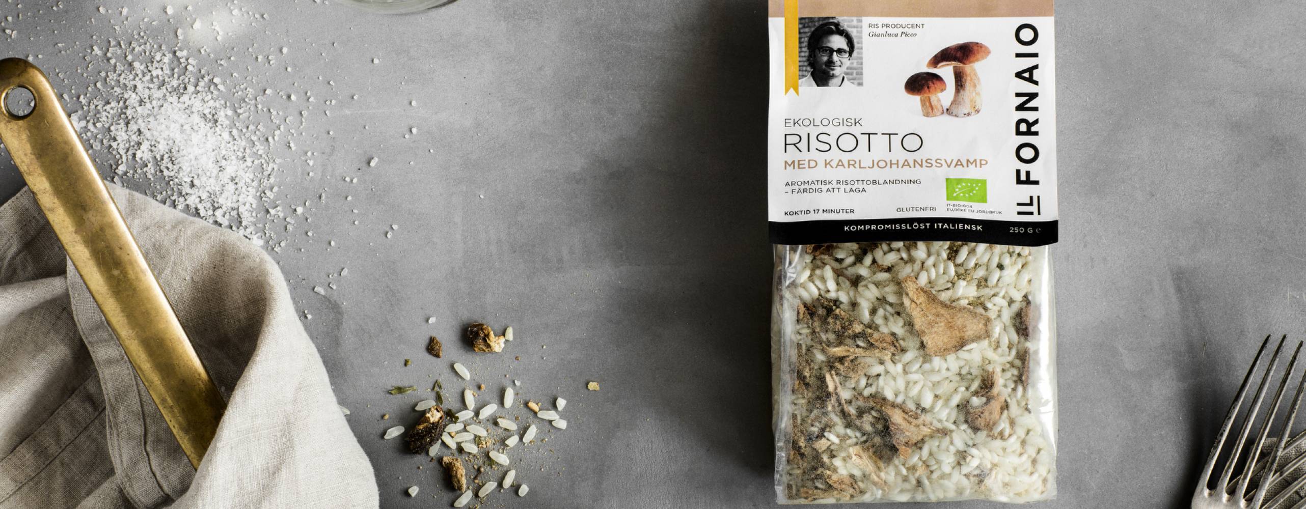 Med Il Fornaios ekologiska risottoblandning kan du fixa äkta italiensk risotto på en kvart! Risotto med karljohansvamp som sätter guldkant på vardagen. Ät som den är eller toppa med lite fräst svamp och persilja. Rekommenderat pris är 45 kr för 250 g (räcker till 4 rätter) och den säljs på Coop, Mathem.se, Mat.se och specialbutiker som NK saluhall i Stockholm.