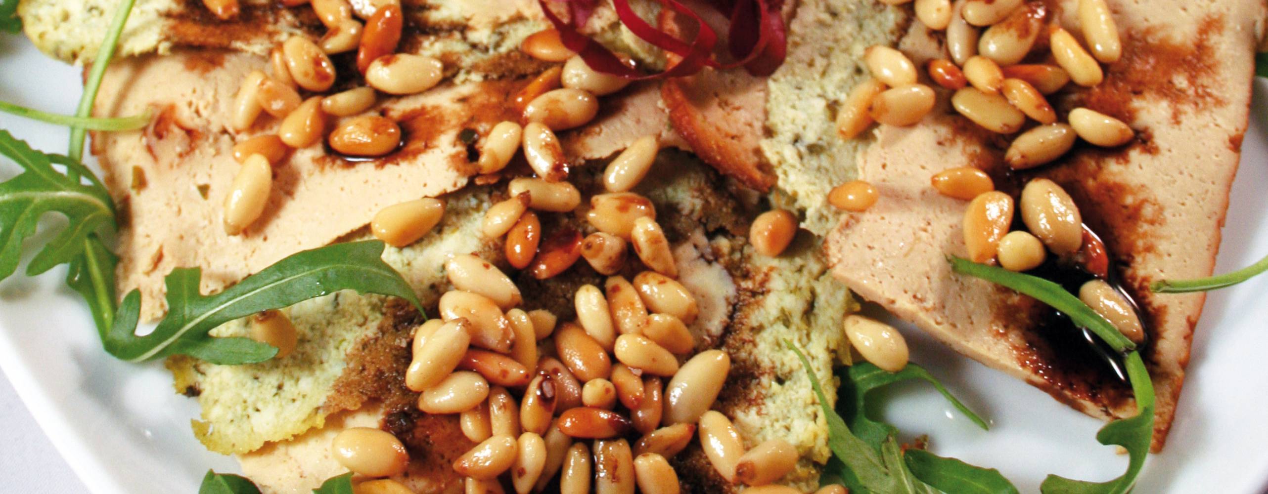 - Hyvla tofun i tunna skivor med hjälp av en osthyvel. Lägg upp skivorna om vartannat på ett serveringsfat och häll över balsamvinägern, garnera med pinjenötter, basilikablad och rucola.