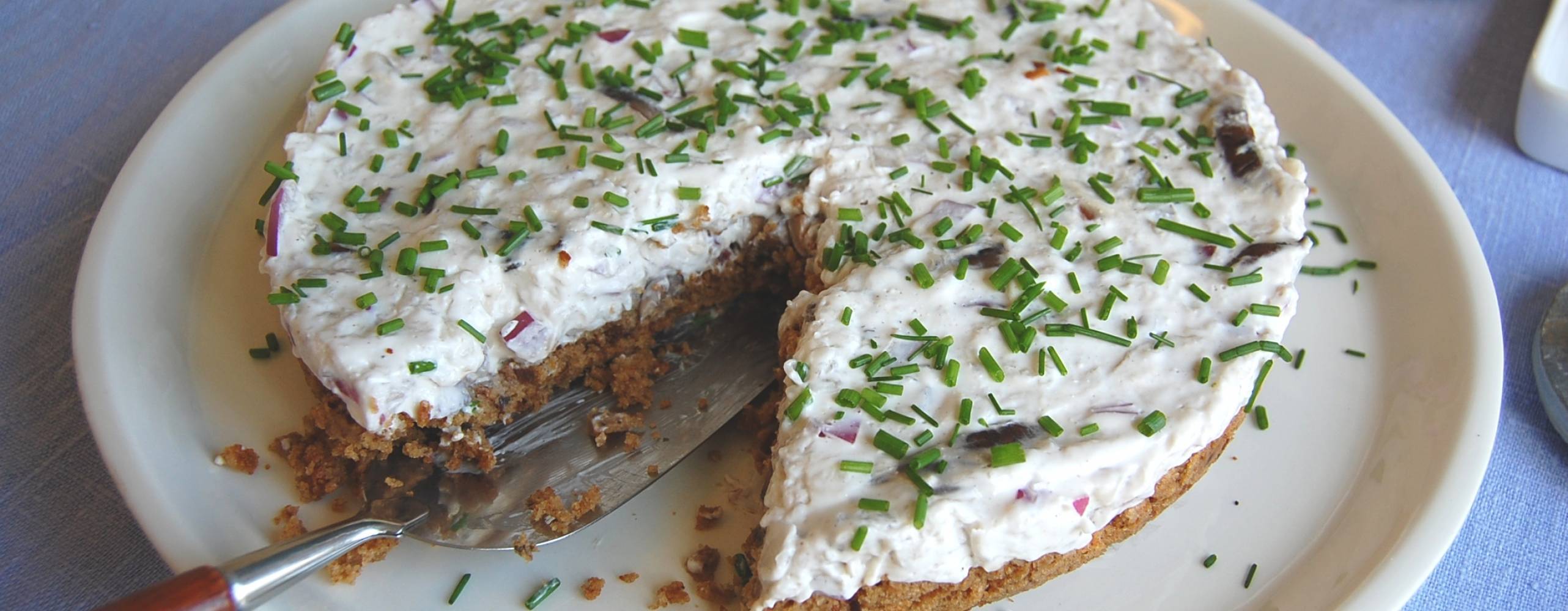 - Lossa tårtan från formen med hjälp av plastfolien och flytta över till ett serveringsfat. Skär gräslöken fint och strö den över.