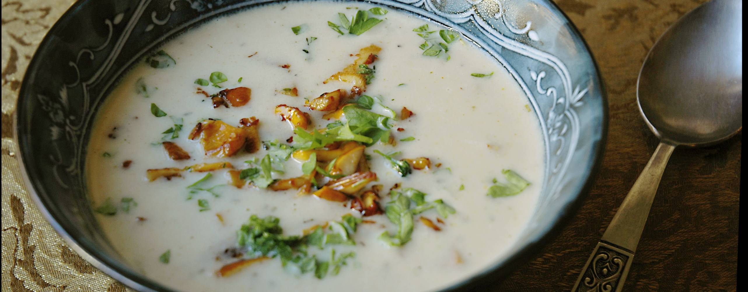 - Mixa soppan med en stavmixer och häll sedan i grädden och de stekta kantarellerna och kryddorna. Låt alltsammans sjuda i 5 minuter. Smaka av med salt och svartpeppar.
