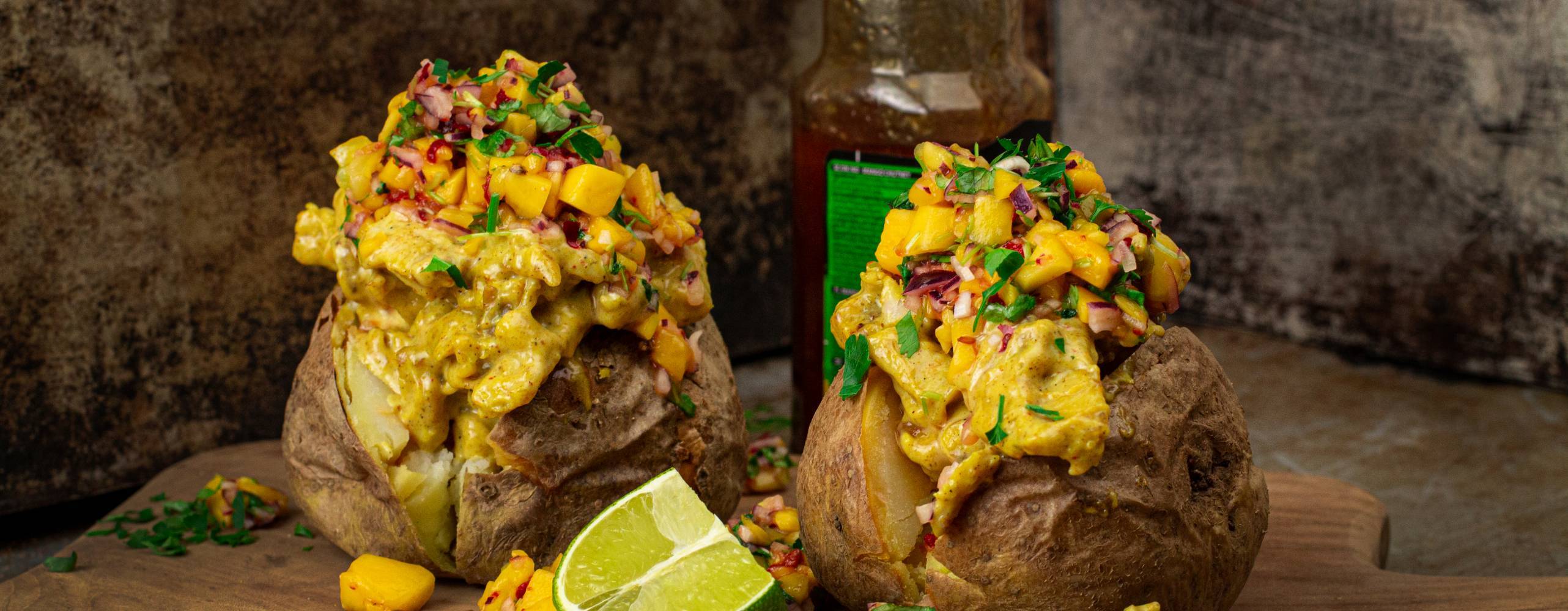 - Skär ett snitt i potatisen och fyll med röran på filetbitar och currymajjon – toppa sedan potatisen med mangosalsan.