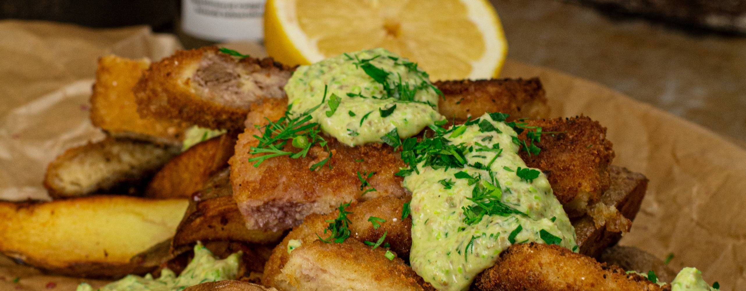 Vegansk Fish'N Chips med pommes, vinäger och ärtremoulad