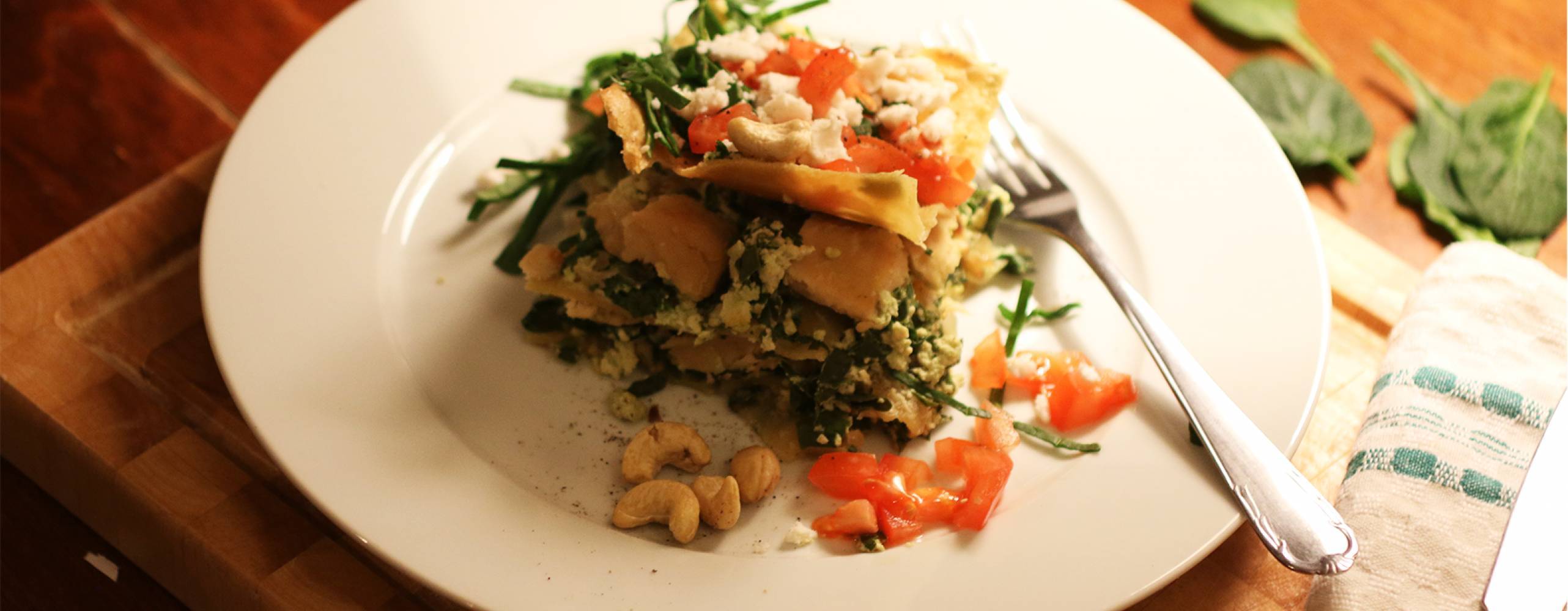 Kycklinglasagne - utan kyckling. Den här lasagnen är full med näring från både spenat, tofu och näringsjäst. Istället för riktig kyckling innehåller den här veganska godingen vegobitar. Kom ihåg att cashewnötterna behöver ligga i blöt i minst 1 timme innan du drar igång med matlagningen!