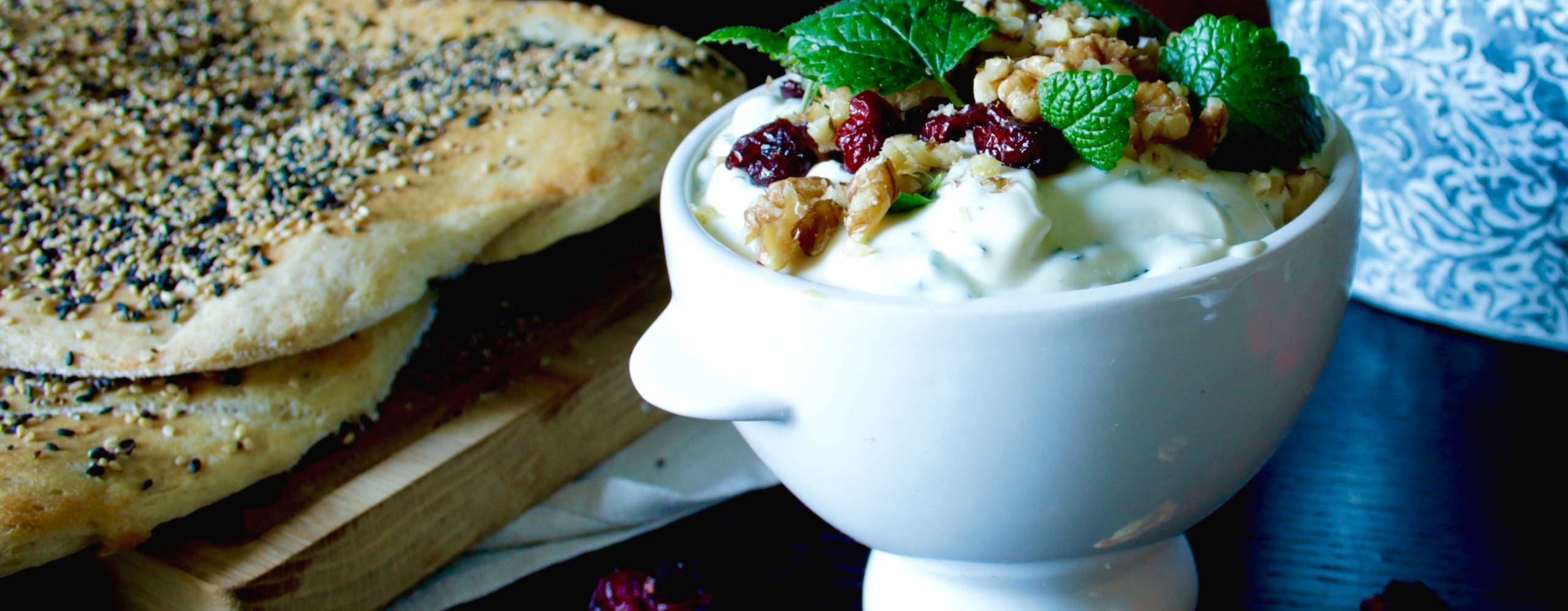 - Ta ut nötterna och låt dem svalna. Under tiden så tärnar du gurkan och blandar med crème fraîchen, dill, mynta, vitlök och salt.