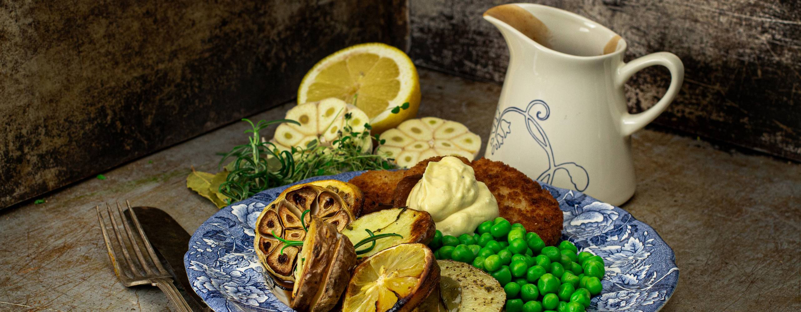 Vegansk schnitzel med rostad potatis, rödvinssås, dijonmajjo och ärter