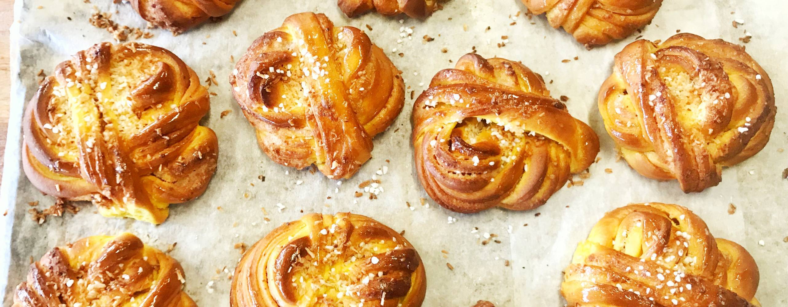 -Vi har haft några provsmakningar och nu är den perfekt. Den som ser ut som en vanlig saffransbulle förutom att det är kokos på toppen istället för pärlsocker, och den har lika tydlig smak av saffran som den klassiska berättar Kirles Barsoum, bagarchef på Bröd & Salt.